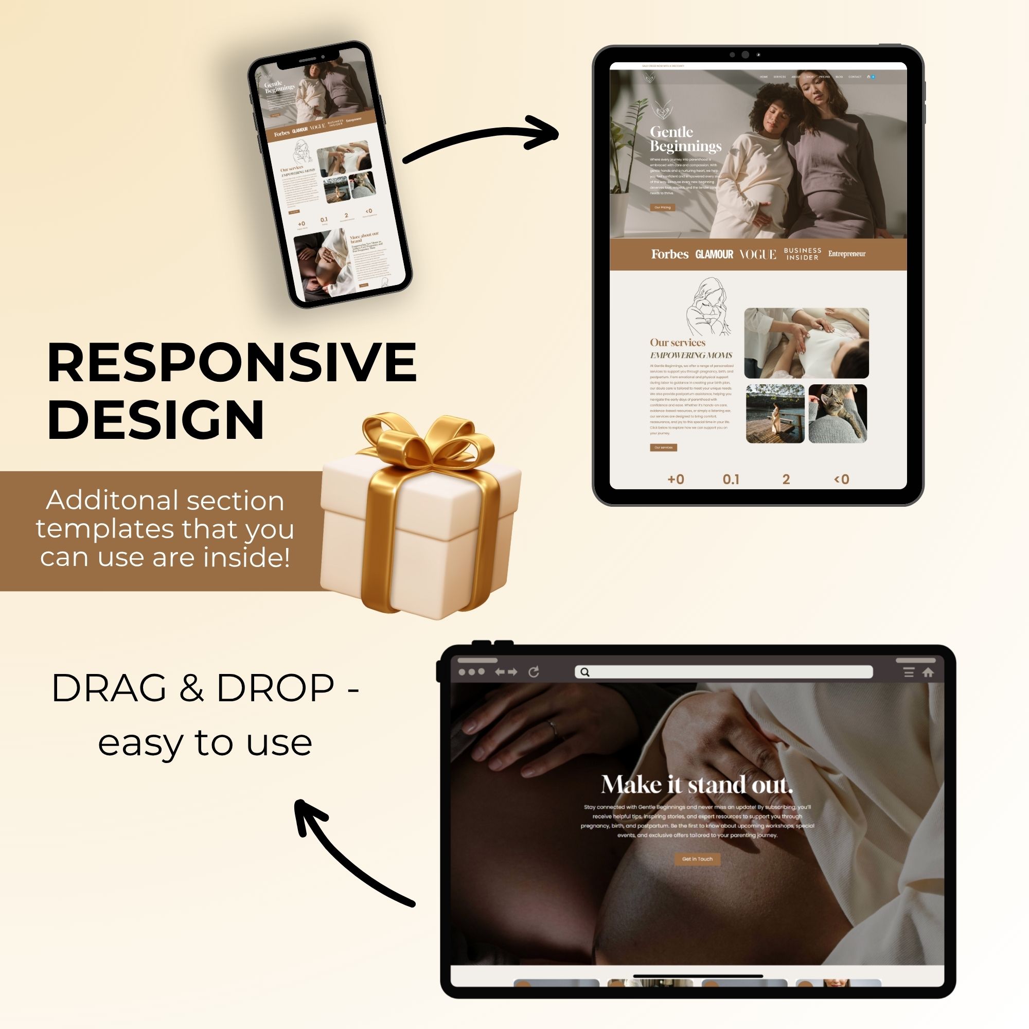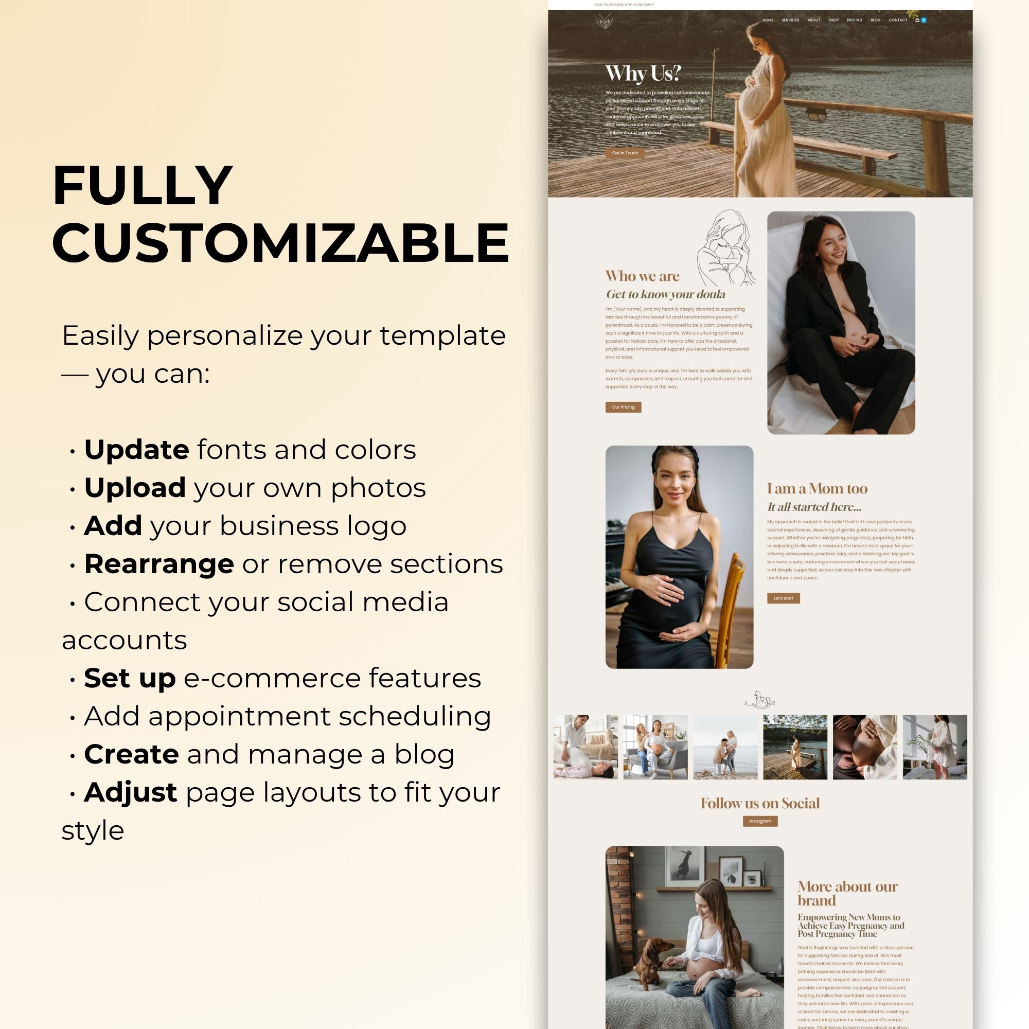 The best part? Save time with pre-written doula content tailored for doulas and midwives, plus an intuitive, drag-and-drop Elementor template for effortless customization. Whether you want to run a WordPress eCommerce shop for birth products or need a polished site for your baby birth services, this WordPress template is designed to support your growing business. Easily customize colors, fonts, and layouts to match your brand and vision! Intrigued by the possibilities? Explore this Doula WordPress Website Template, perfect for a birth worker website, midwife website or baby birth services. Elevate your online presence with this pastel and warm WordPress design, tailored for doulas and maternity professionals looking to connect with expecting parents.