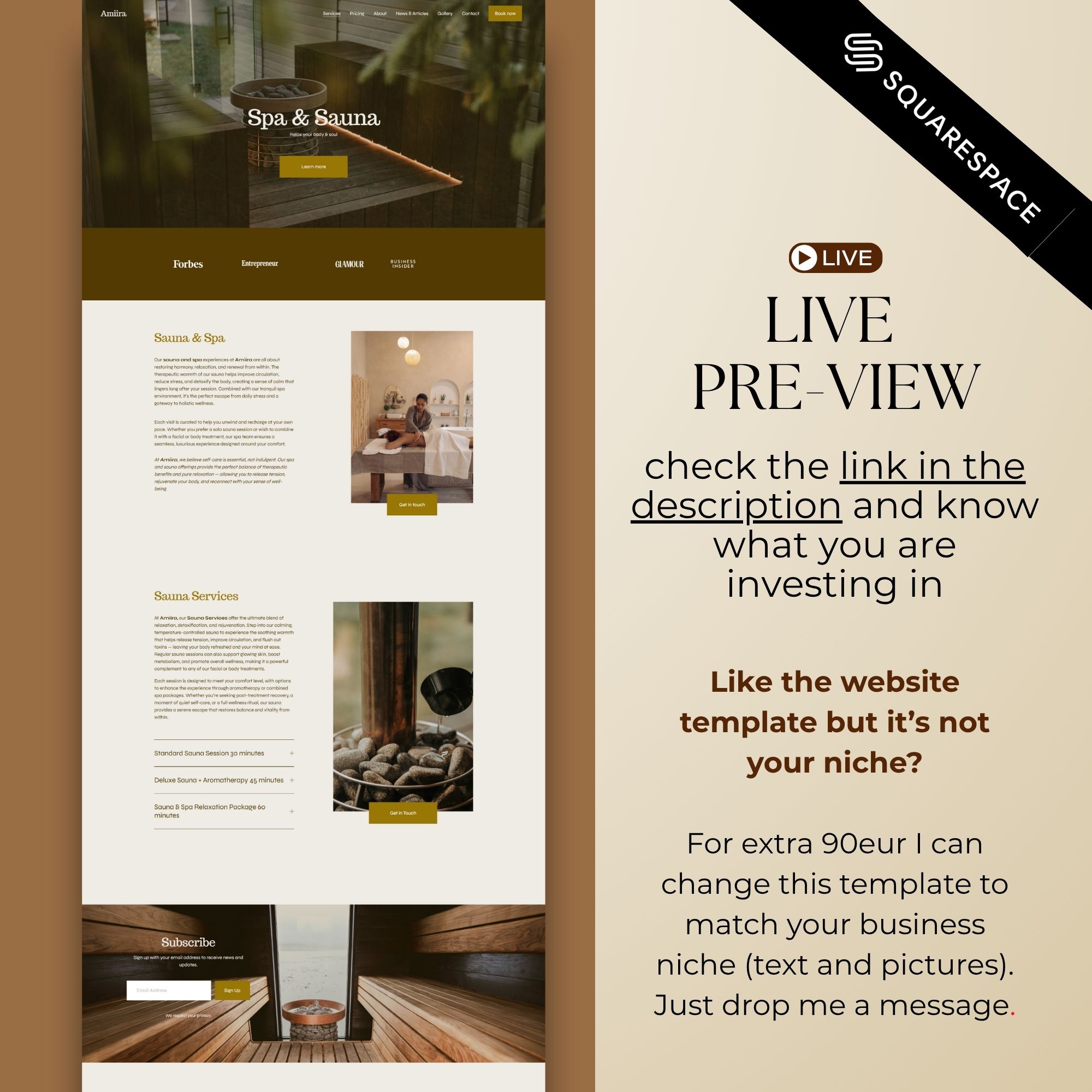 This Luxury Spa Squarespace Template features a polished, elegant design perfect for showcasing your services β from botox and injectables to facials, waxing, skincare treatments, and wellness programs. With clean layouts, stylish typography, and high-end visuals, it helps you stand out online and attract clients who value sophistication and trust.